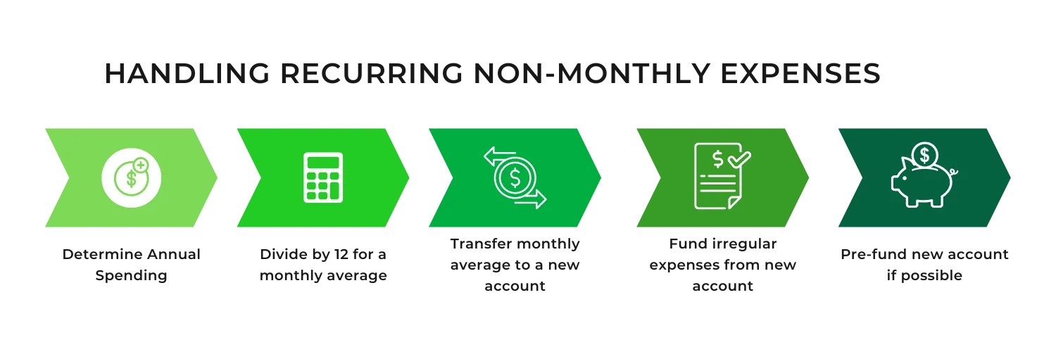 - Use the money from this new savings account to pay these irregular expenses as they occur.